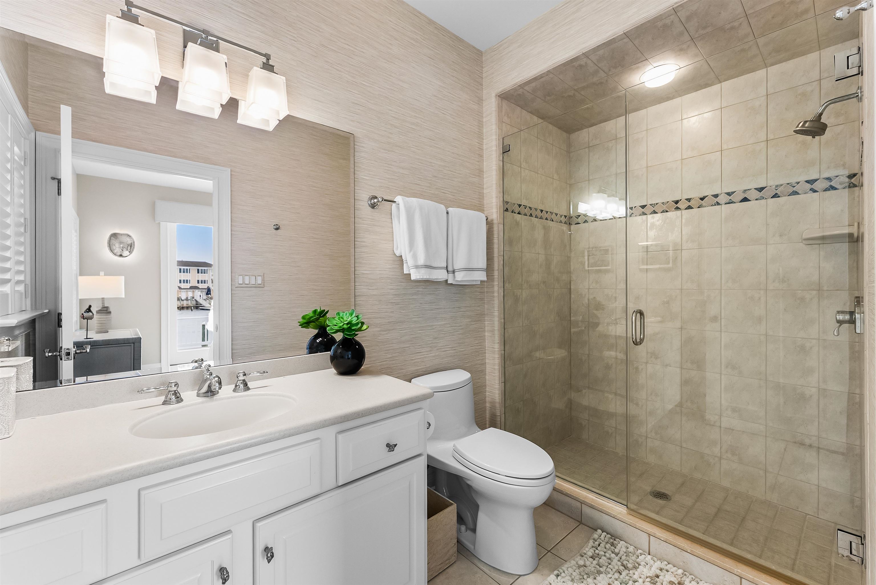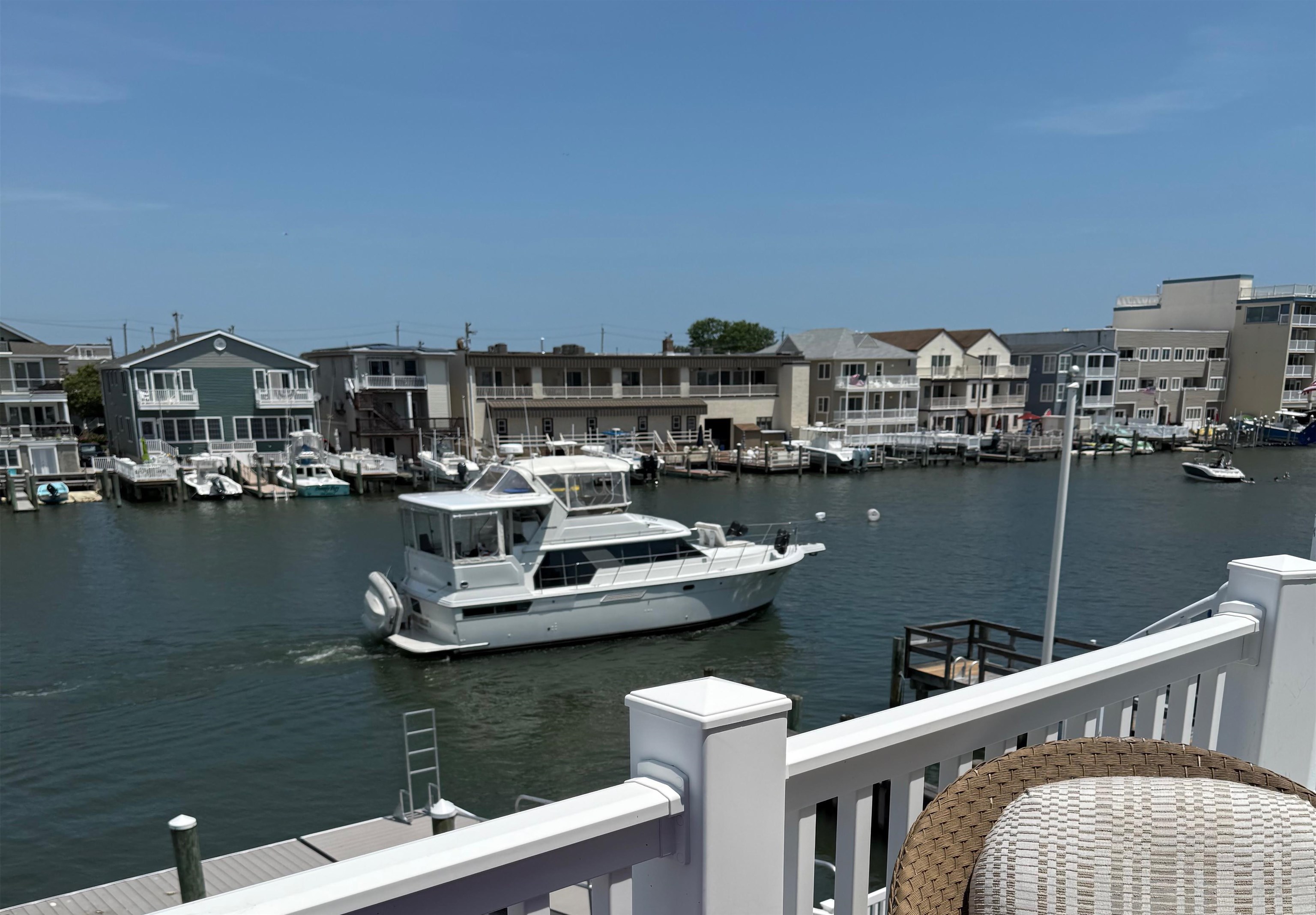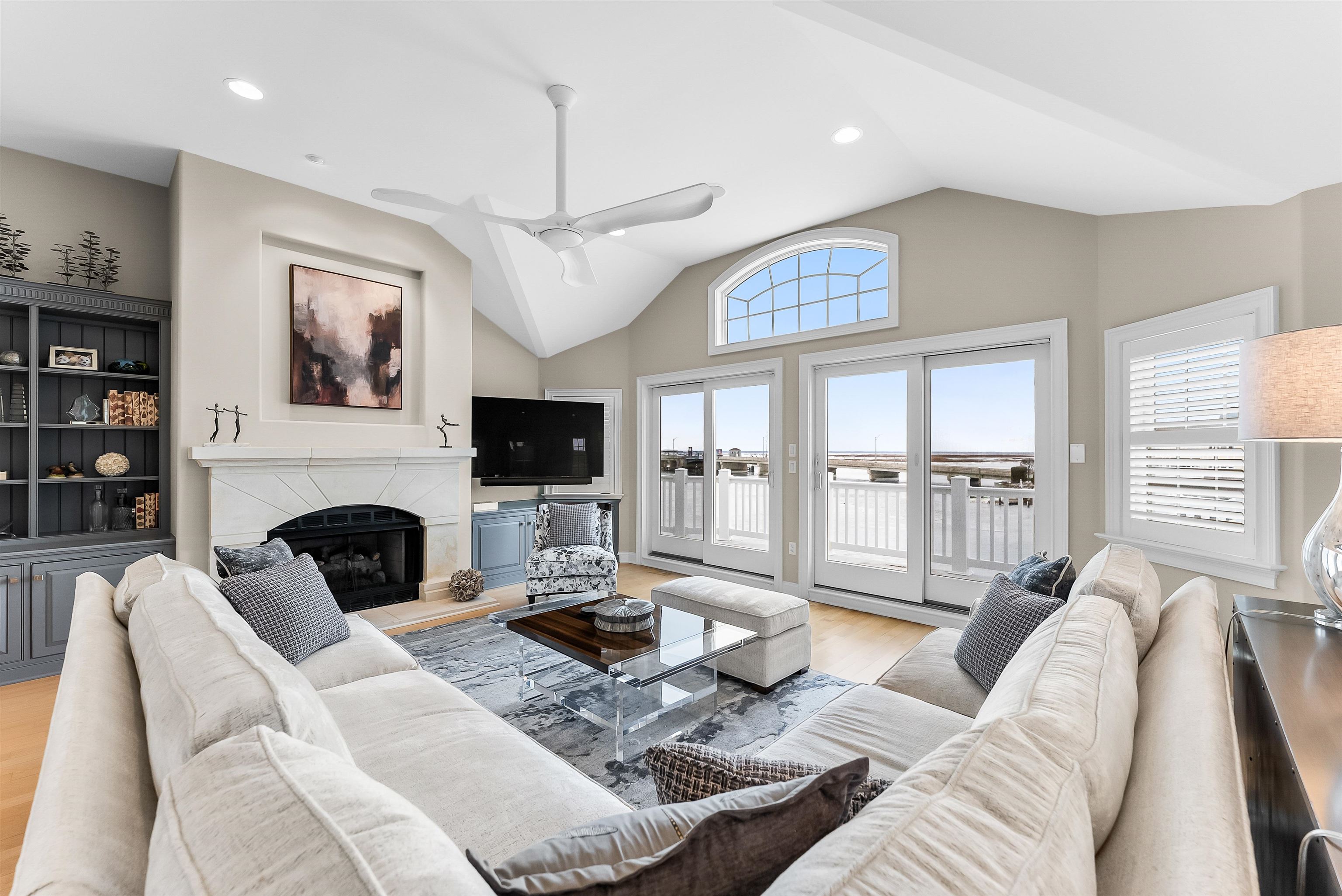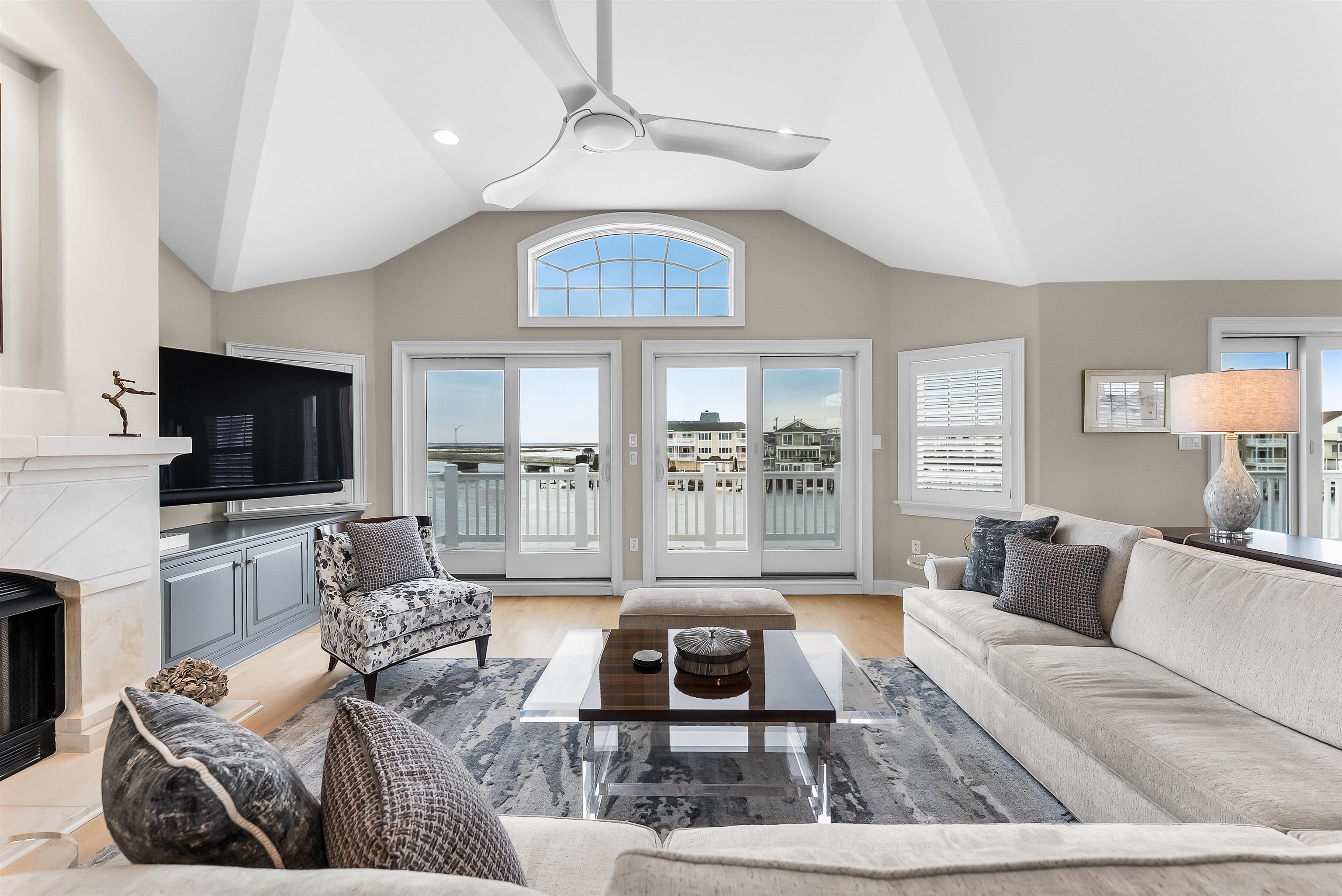 Set on the bay in Stone Harbor, this gorgeous 4-bedroom, 3 and a half bath home offers a luxurious waterfront lifestyle with finishes and features that really stand out. Completely renovated by D.L. Miner, the home blends clean, soft coastal design with a layout built for entertaining and easy living. Outside, enjoy a newer single floating dock and a mahogany bayfront deck that is sheltered by two remotely operated awnings for shade on command. Inside, a stunning two-story foyer opens to the sun-drenched family room complete with a wet bar and floor- to-ceiling views of the bay. There are three bedrooms and two full baths on this level. Two of the bedrooms (one on suite) feature bay views and private decks. This level also offers a full-service laundry room, hardwood floors in the living space, and carpet in the bedrooms. The home features custom plantation shutters and remotely operated blinds. An attached one car garage provides plenty of room for a car or golf cart, as well as pool chairs, surf boards and storage. The living and dining rooms at the top of the stairs are both elegant and comfortable – perfect for entertaining or relaxing. There is a gorgeous fireplace and large screen television. A generous bayfront deck extends your living space outdoors and brings the beauty of the bay into the home. The adjoining large custom kitchen has quartz counters, a Thermador gas range and refrigerator, multi-level countertops and, of course, magnificent views of the bay. The second floor is anchored to the west by an expansive primary suite with walk in closets and a private deck overlooking the bay. A large primary bath features heated porcelain floors, double sinks, and walk-in shower. A lovely powder room off the living room is convenient for guests. This location is exceptional, a short walk to downtown Stone Harbor’s shops and restaurants, with beautiful bay views that make every summer evening at the shore special.