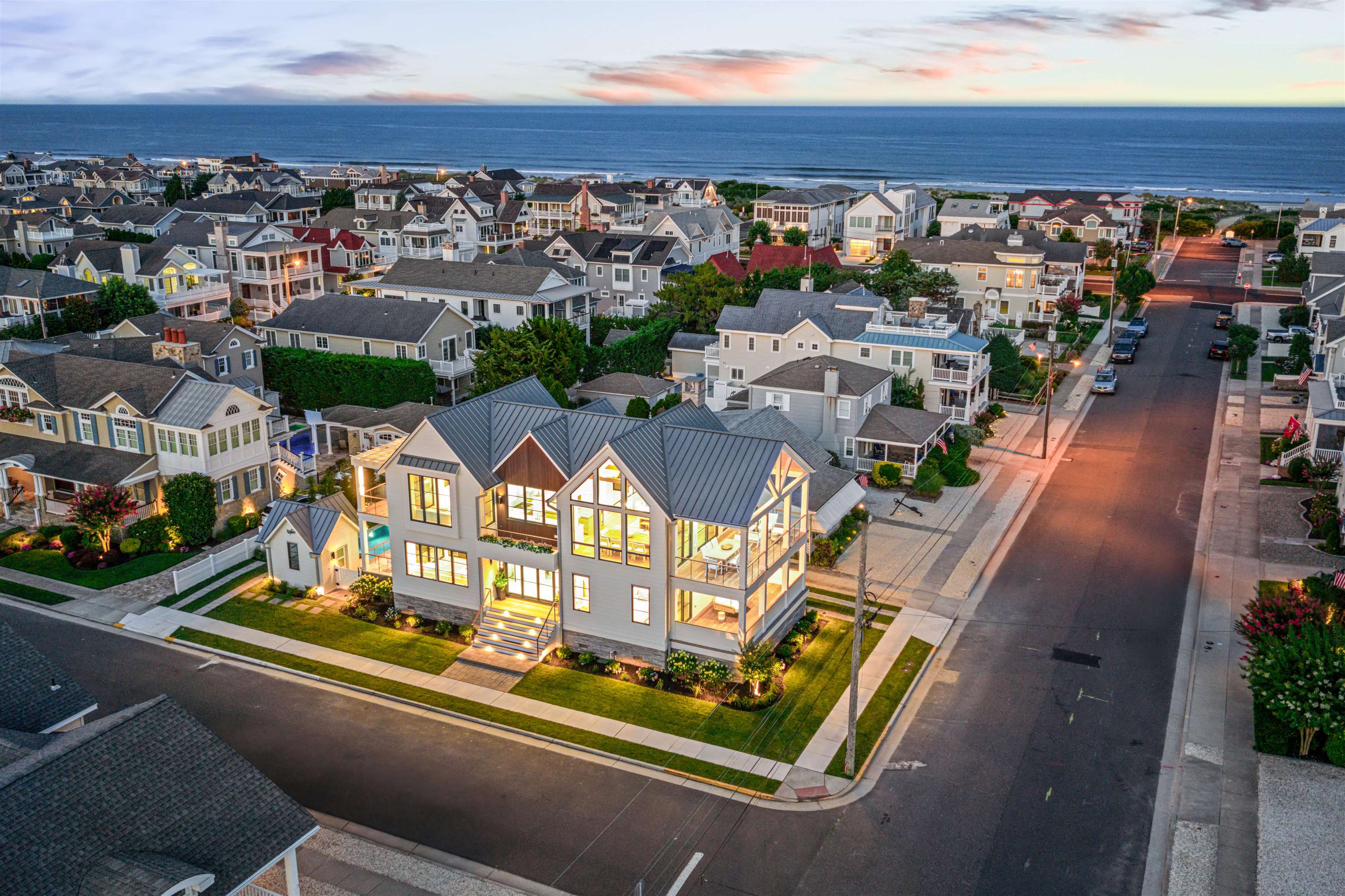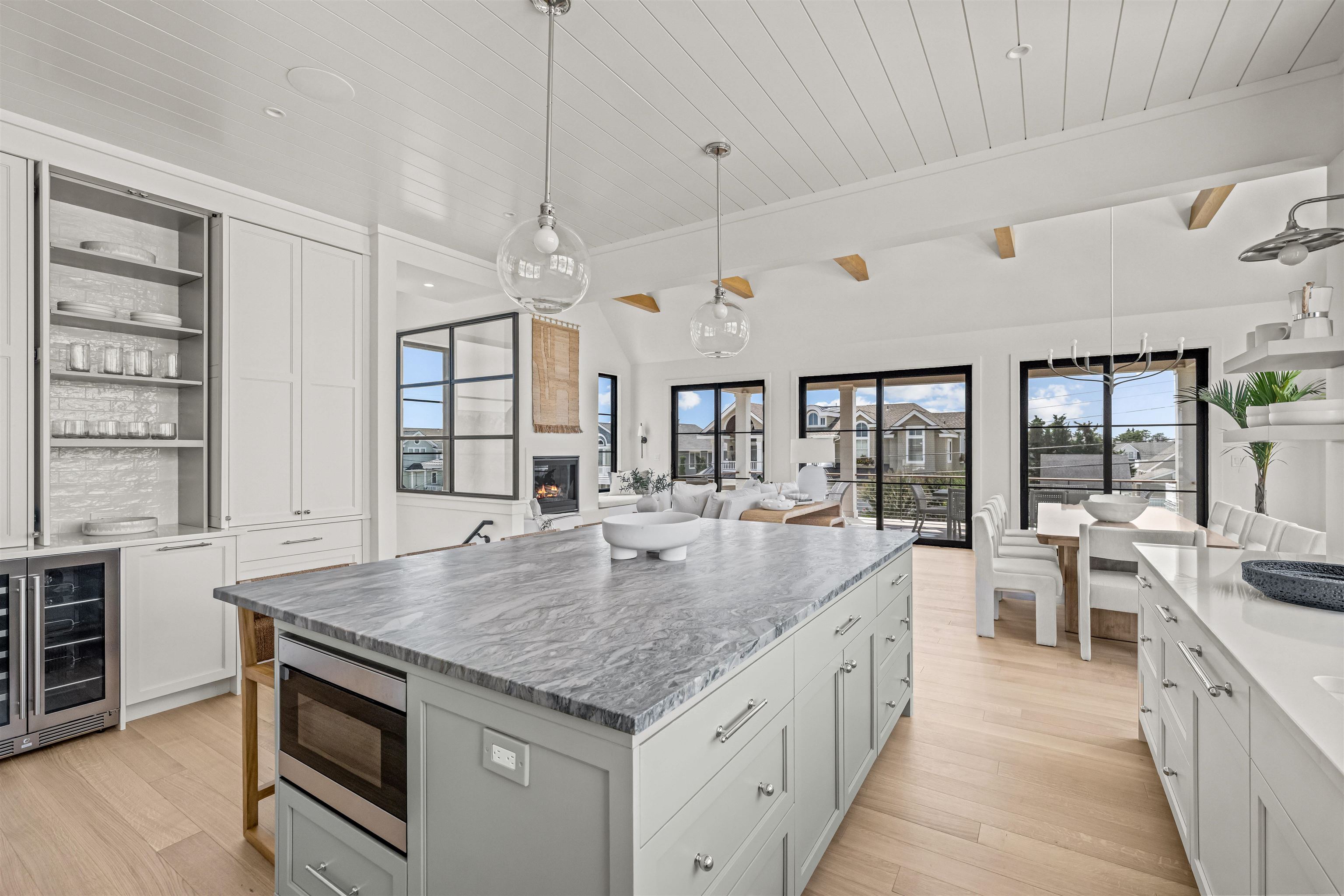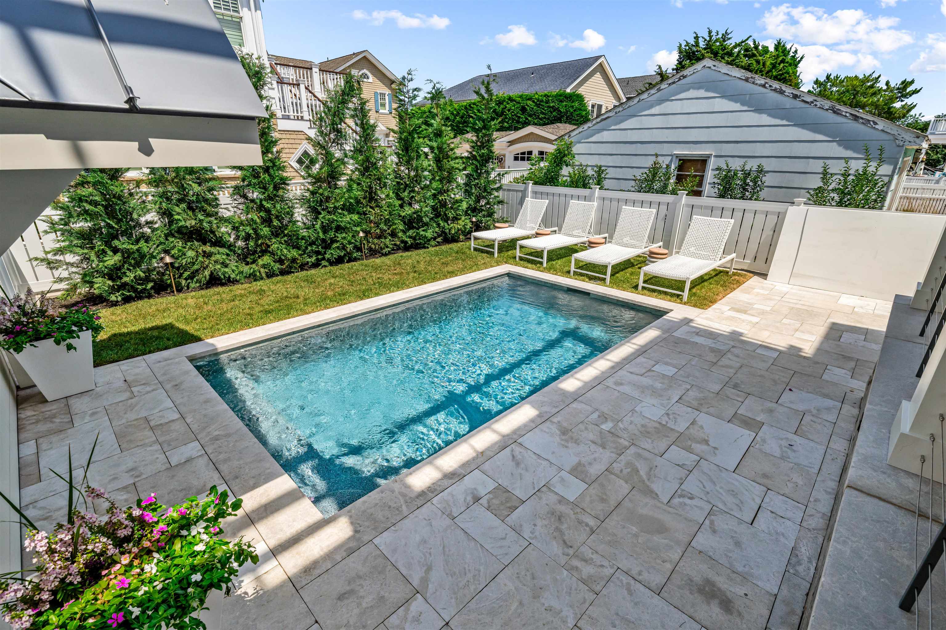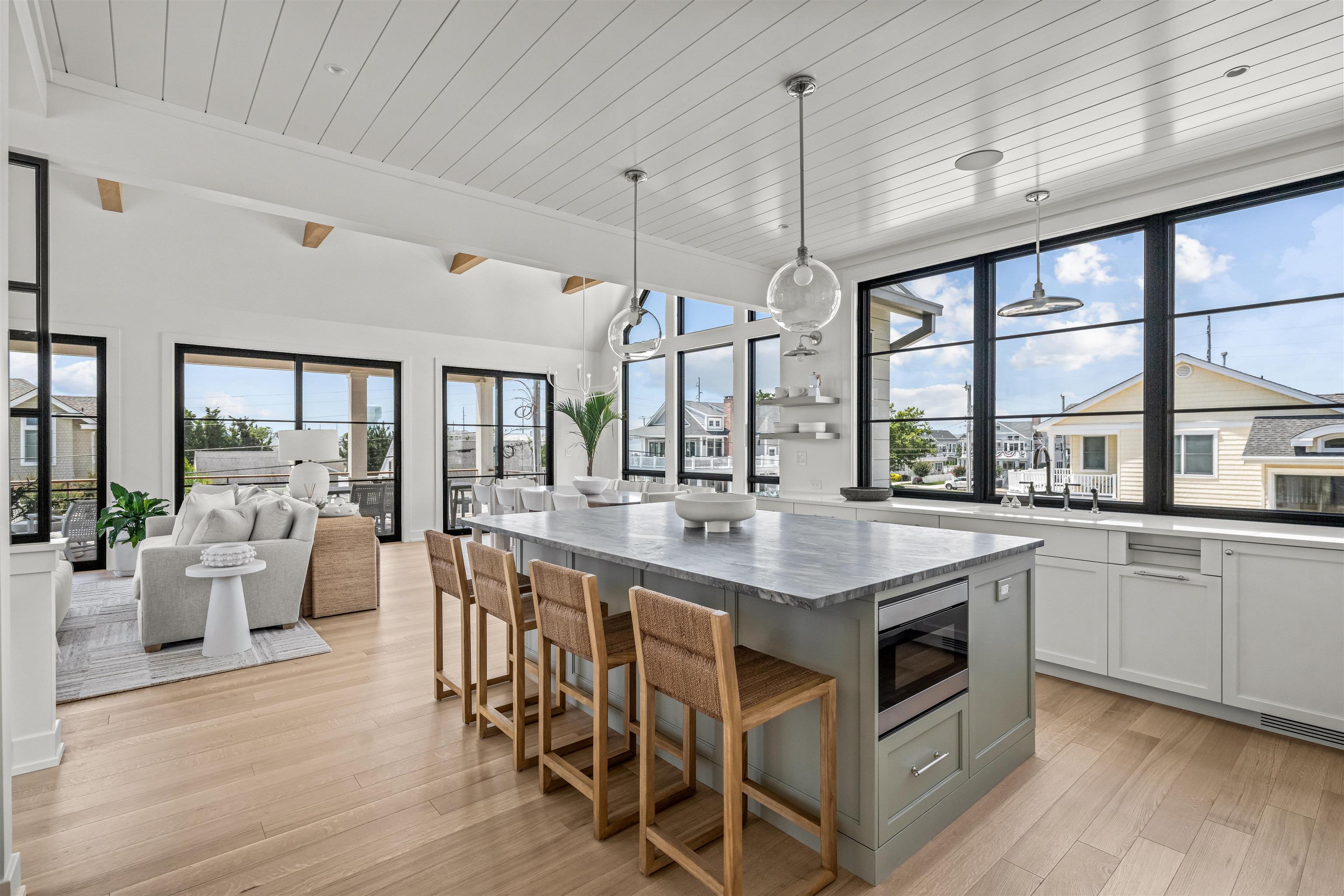This brand new, fully custom home is brought to you by Wolstenholme Associates and WA Interiors in collaboration with McLaughlin Construction, this 5-bedroom, 5.5-bath home is offered fully designer-furnished and accessorized. The exterior finishes were selected with sustainability, aesthetics, and longevity in mind. The cladding includes a mix of Acre ship lap siding with 10” exposure and reSAWN’s MYNAH thermally modified radiata pine. A standing seam metal roof in a weathered zinc finish carries a 50-year warranty, while Marvin windows and doors in a gunmetal finish tie seamlessly together. All decks are finished in Ipe decking and stainless-steel cable railings capped in Ipe. The pool area is finished with Marmiro sandblasted marble and a PebbleSheen plaster pool surface. Inside, the first floor family room is accessed through an ALLI metal pocket door, includes custom built-ins by Village Handcrafted Cabinetry and a handmade Moroccan Zellige tile backsplash. Sliding glass doors open to a raised patio that overlooks the pool, seamlessly extending the living space outdoors. A first-floor bedroom with ensuite bath located at the front of the home, offering ocean breezes and access to a spacious front deck. It features European white oak flooring and Phillip Jeffries grass cloth wallpaper. The bathroom features a Carrara marble top vanity, Indigo Seville ceramic tile, and marble mosaic floors. The second bedroom also opens to the front porch, and is outfitted with shiplap millwork, a custom-built-in, and two custom Spanish-made pendant lights. The bathroom features AKDO’s Sio Cubic Plaid porcelain floor tile and marble mosaic accents. A third bedroom – complete with custom bunk beds – includes its own ensuite with a honed penny round tile floor and featured millwork. The powder room stands out with a custom floating concrete vanity, integrated concrete sink, and hand-painted Moroccan tile. Commissioned artwork by Kirby Fredendall adorns the foyer, while a fully equipped laundry room is thoughtfully placed between the bedrooms. Upstairs, the home opens to dramatic vaulted ceilings and sweeping ocean views. Subtle details include mud-in stair lighting, concealed Sonance speakers, and a Portola Paints plaster fireplace surround. The kitchen features a large island with leathered quartzite, Bertazzoni range, Sub-Zero refrigerator, and a full coffee bar with beverage fridge and ice maker. A custom maple dining table seats ten and overlooks the expansive living room. Through multiple sliding doors, a large front deck offers additional entertaining space and breathtaking views of the 89th Street beach path and the ocean beyond. The fourth bedroom serves as a work-from-home space, complete with queen-sized Murphy bed, custom built-ins, with an adjacent full bath. The primary suite is a tranquil retreat with custom built-ins, spa-style bath clad in Arabescato Altissimo marble throughout, and a low-iron glass shower enclosure. Both bedrooms open to a private rear deck with pergola, overlooking the backyard and pool. Additional highlights include polished nickel fixtures by Kohler and wide-plank European white oak floors. Located just one block from one of Stone Harbor’s finest beaches and only two blocks to dining and nightlife, this corner-lot home sits in one of the island's most desirable residential enclaves. For additional specs and amenities on this completely custom Wolstenholme Associates home.