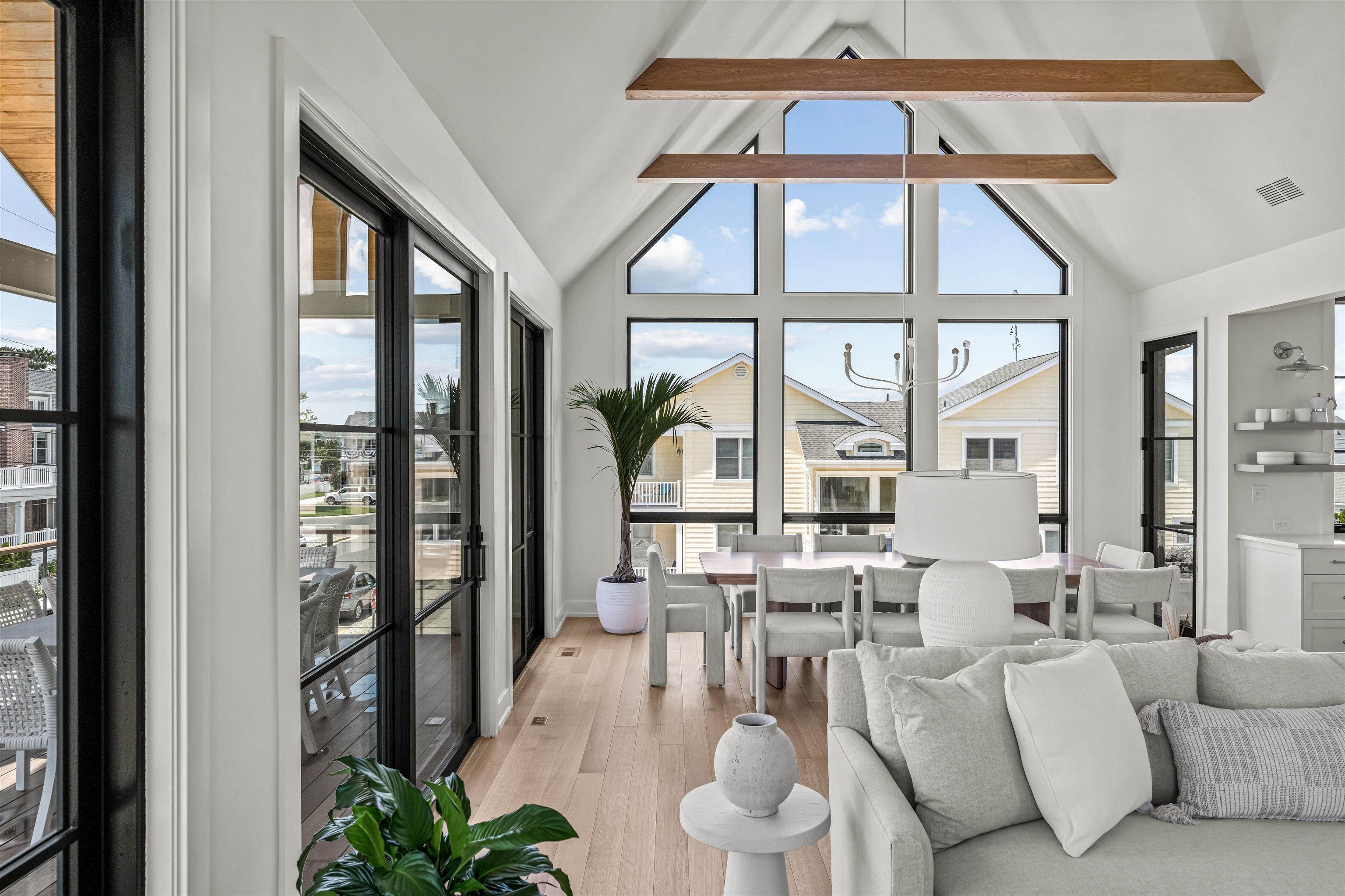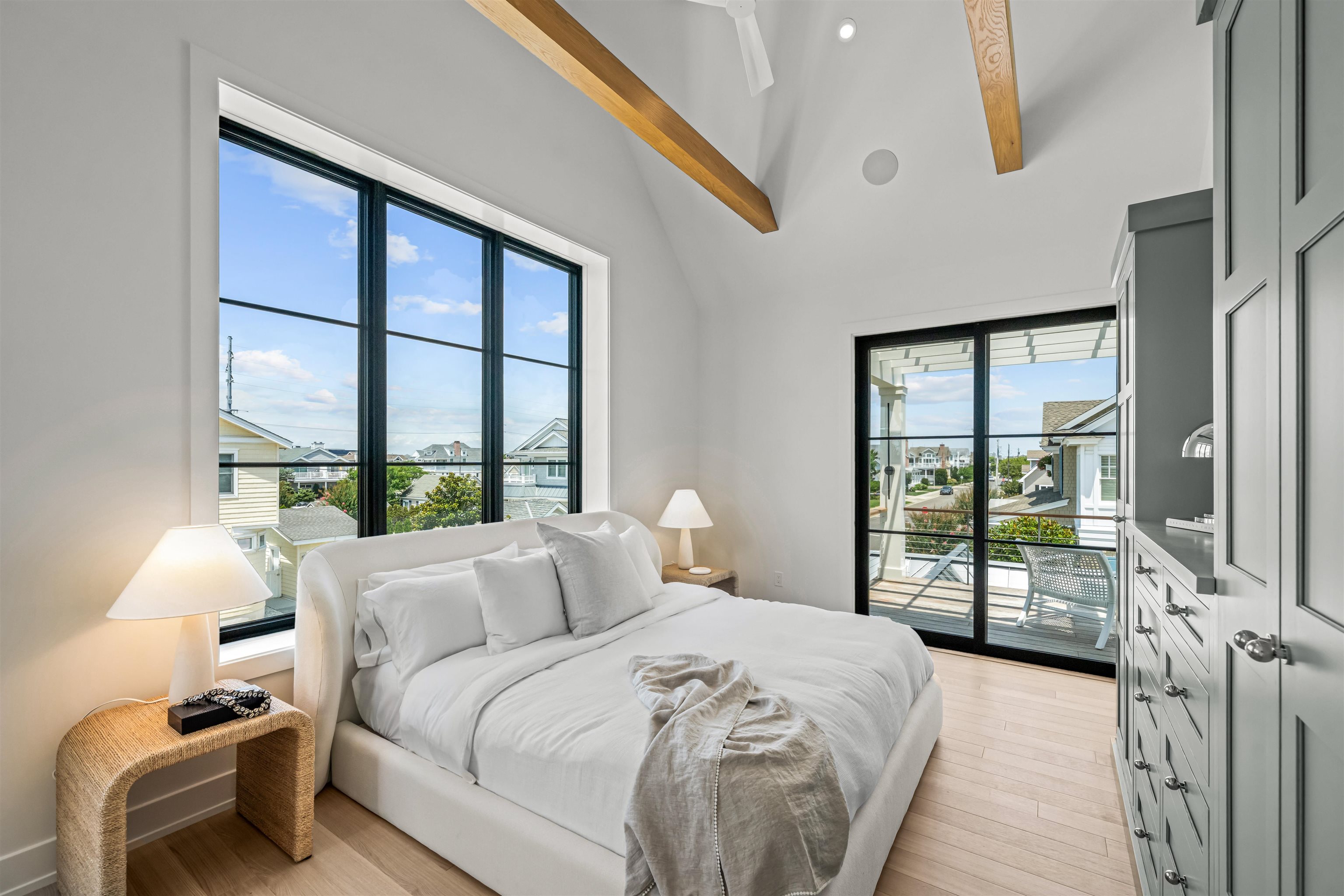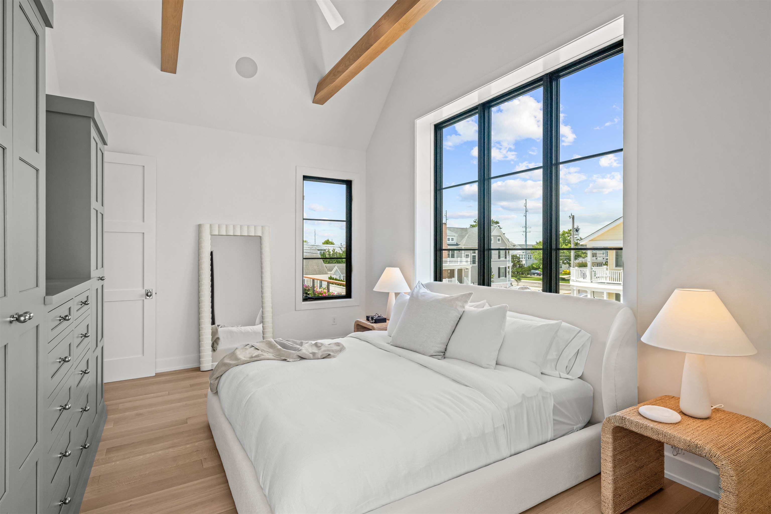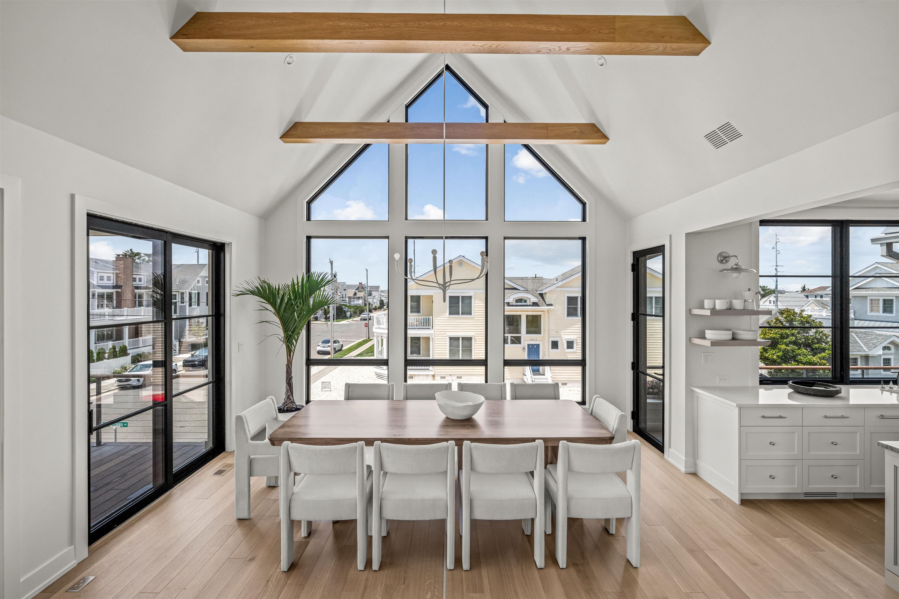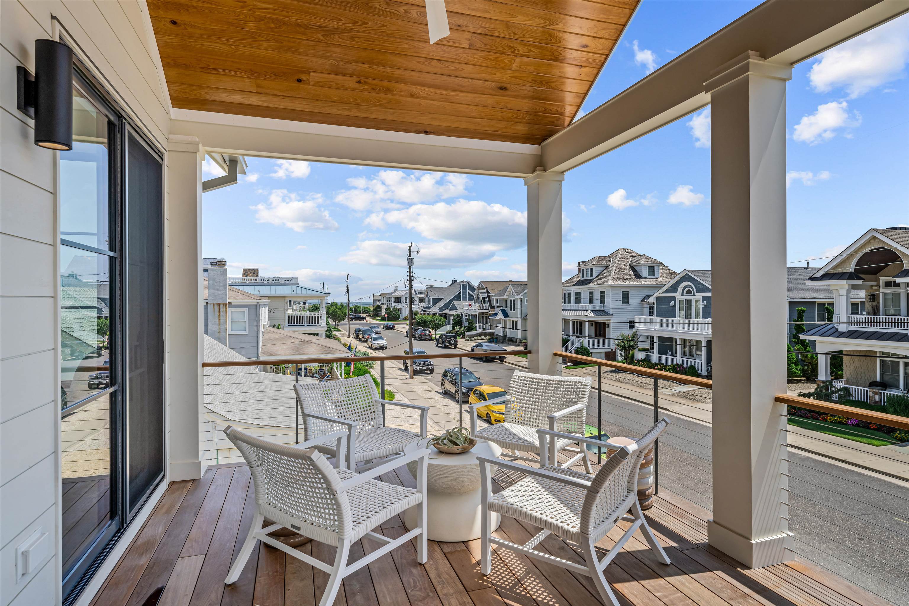 This brand new, fully custom home is brought to you by Wolstenholme Associates and WA Interiors in collaboration with McLaughlin Construction, this 5-bedroom, 5.5-bath home is offered fully designer-furnished and accessorized. The exterior finishes were selected with sustainability, aesthetics, and longevity in mind. The cladding includes a mix of Acre ship lap siding with 10” exposure and reSAWN’s MYNAH thermally modified radiata pine. A standing seam metal roof in a weathered zinc finish carries a 50-year warranty, while Marvin windows and doors in a gunmetal finish tie seamlessly together. All decks are finished in Ipe decking and stainless-steel cable railings capped in Ipe. The pool area is finished with Marmiro sandblasted marble and a PebbleSheen plaster pool surface. Inside, the first floor family room is accessed through an ALLI metal pocket door, includes custom built-ins by Village Handcrafted Cabinetry and a handmade Moroccan Zellige tile backsplash. Sliding glass doors open to a raised patio that overlooks the pool, seamlessly extending the living space outdoors. A first-floor bedroom with ensuite bath located at the front of the home, offering ocean breezes and access to a spacious front deck. It features European white oak flooring and Phillip Jeffries grass cloth wallpaper. The bathroom features a Carrara marble top vanity, Indigo Seville ceramic tile, and marble mosaic floors. The second bedroom also opens to the front porch, and is outfitted with shiplap millwork, a custom-built-in, and two custom Spanish-made pendant lights. The bathroom features AKDO’s Sio Cubic Plaid porcelain floor tile and marble mosaic accents. A third bedroom – complete with custom bunk beds – includes its own ensuite with a honed penny round tile floor and featured millwork. The powder room stands out with a custom floating concrete vanity, integrated concrete sink, and hand-painted Moroccan tile. Commissioned artwork by Kirby Fredendall adorns the foyer, while a fully equipped laundry room is thoughtfully placed between the bedrooms. Upstairs, the home opens to dramatic vaulted ceilings and sweeping ocean views. Subtle details include mud-in stair lighting, concealed Sonance speakers, and a Portola Paints plaster fireplace surround. The kitchen features a large island with leathered quartzite, Bertazzoni range, Sub-Zero refrigerator, and a full coffee bar with beverage fridge and ice maker. A custom maple dining table seats ten and overlooks the expansive living room. Through multiple sliding doors, a large front deck offers additional entertaining space and breathtaking views of the 89th Street beach path and the ocean beyond. The fourth bedroom serves as a work-from-home space, complete with queen-sized Murphy bed, custom built-ins, with an adjacent full bath. The primary suite is a tranquil retreat with custom built-ins, spa-style bath clad in Arabescato Altissimo marble throughout, and a low-iron glass shower enclosure. Both bedrooms open to a private rear deck with pergola, overlooking the backyard and pool. Additional highlights include polished nickel fixtures by Kohler and wide-plank European white oak floors. Located just one block from one of Stone Harbor’s finest beaches and only two blocks to dining and nightlife, this corner-lot home sits in one of the island's most desirable residential enclaves. For additional specs and amenities on this completely custom Wolstenholme Associates home.