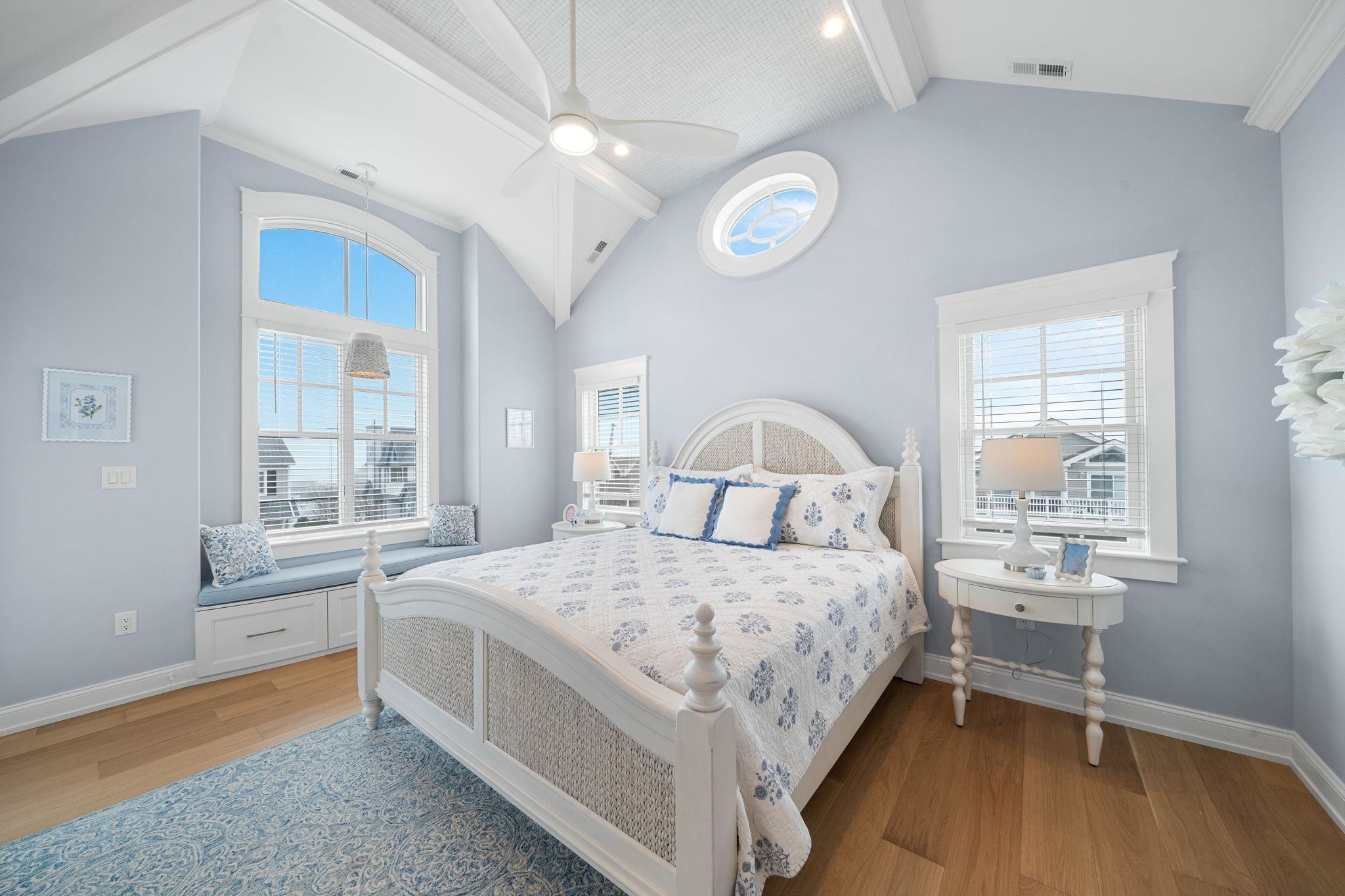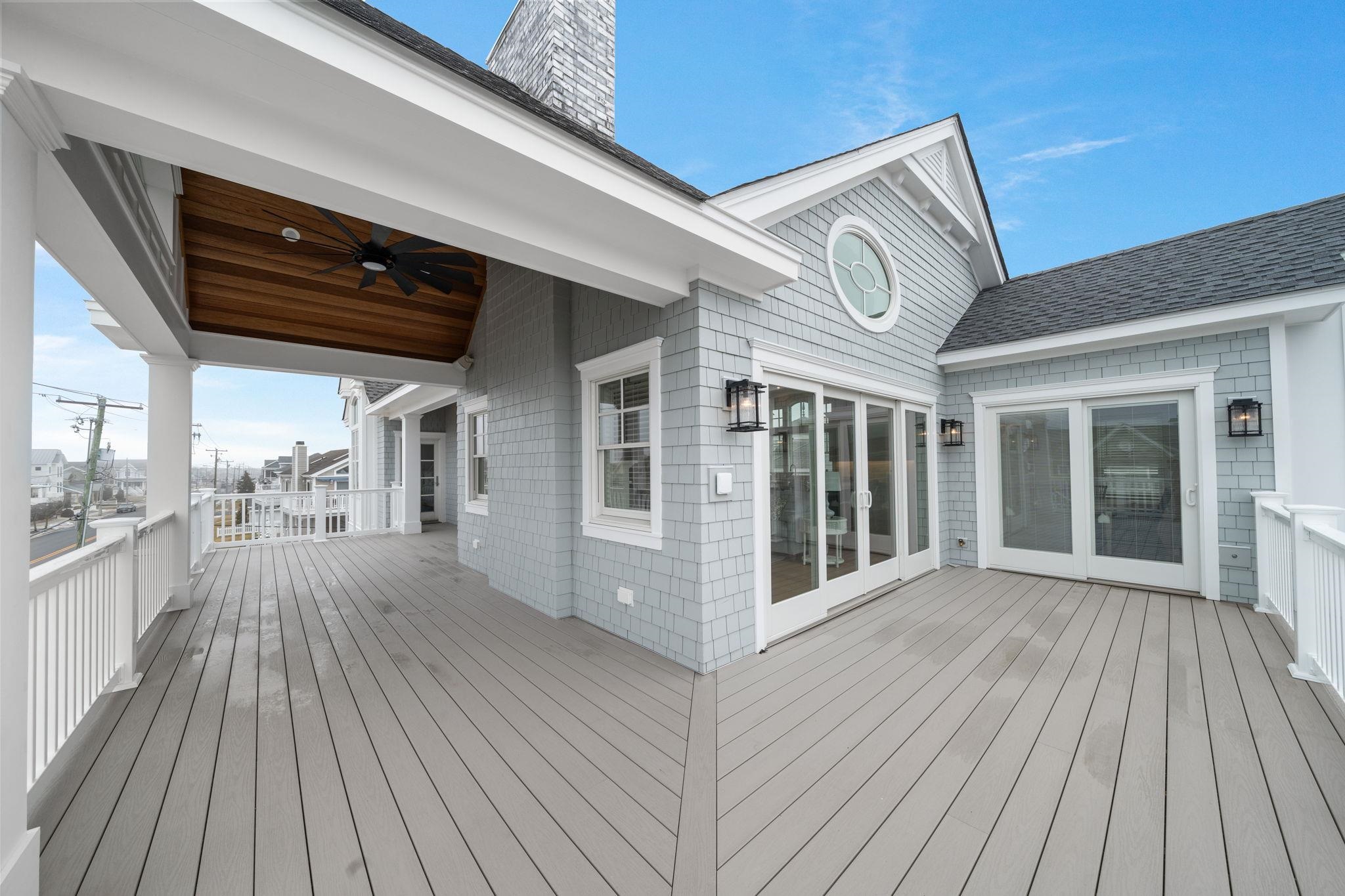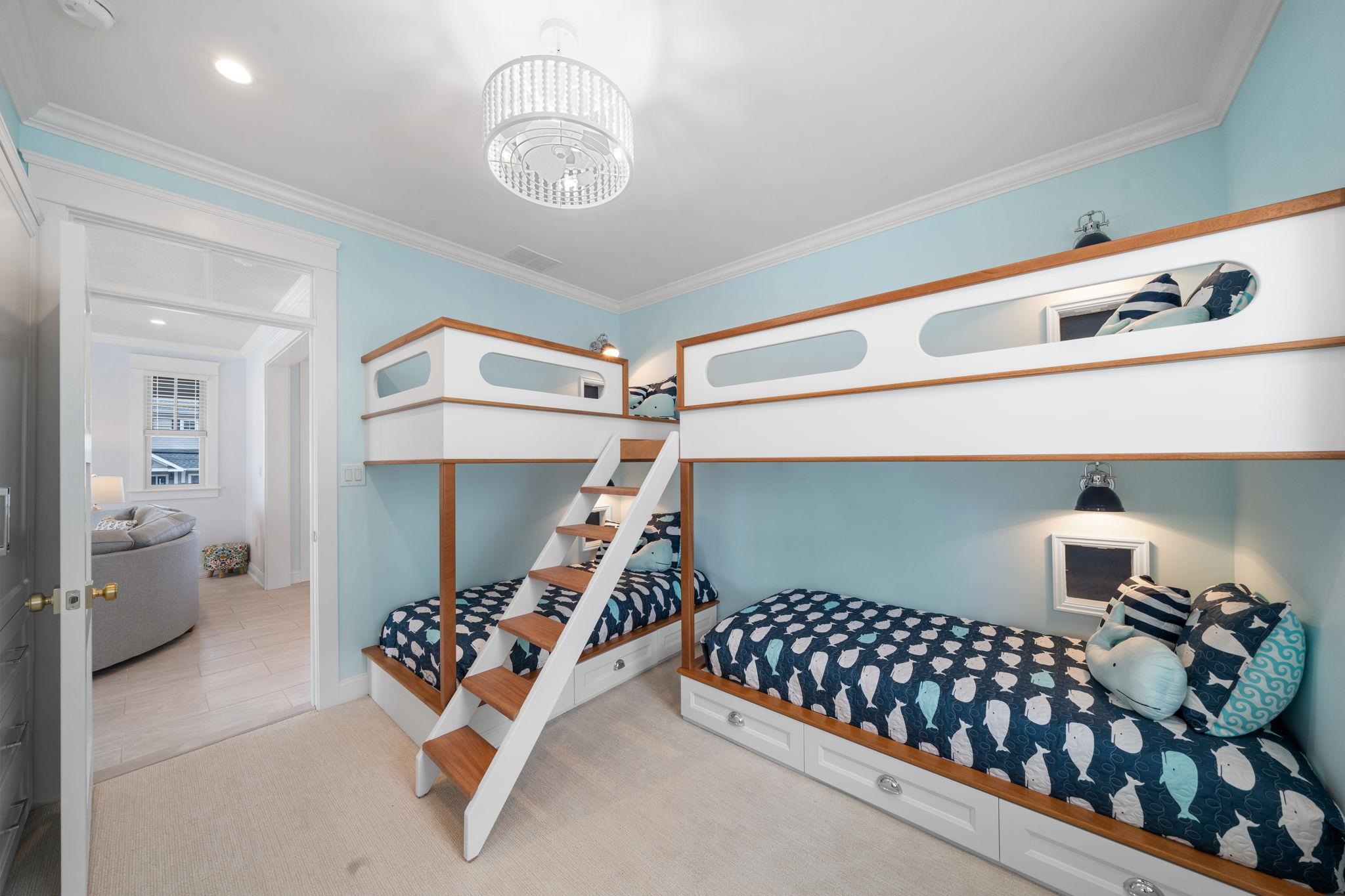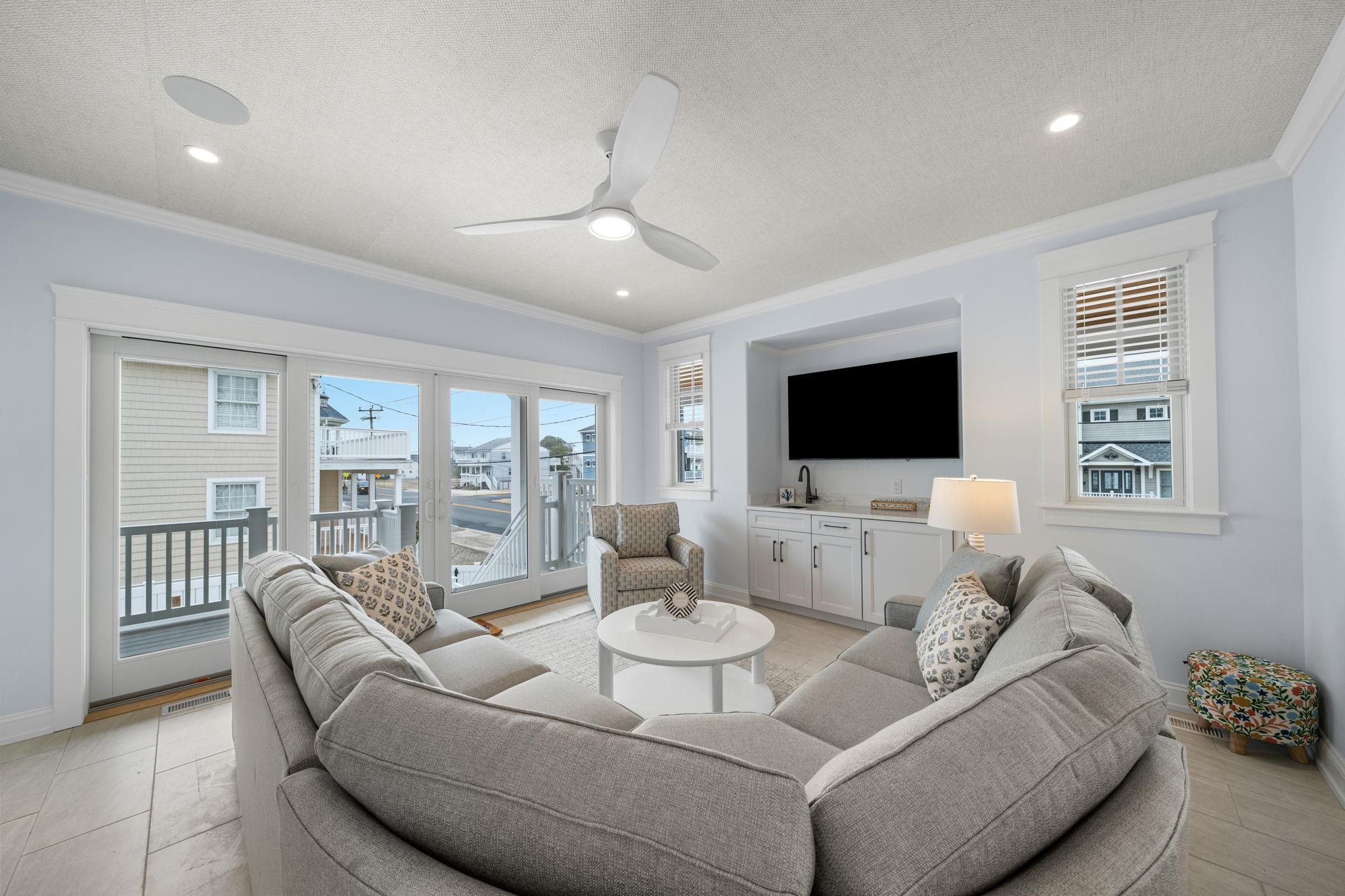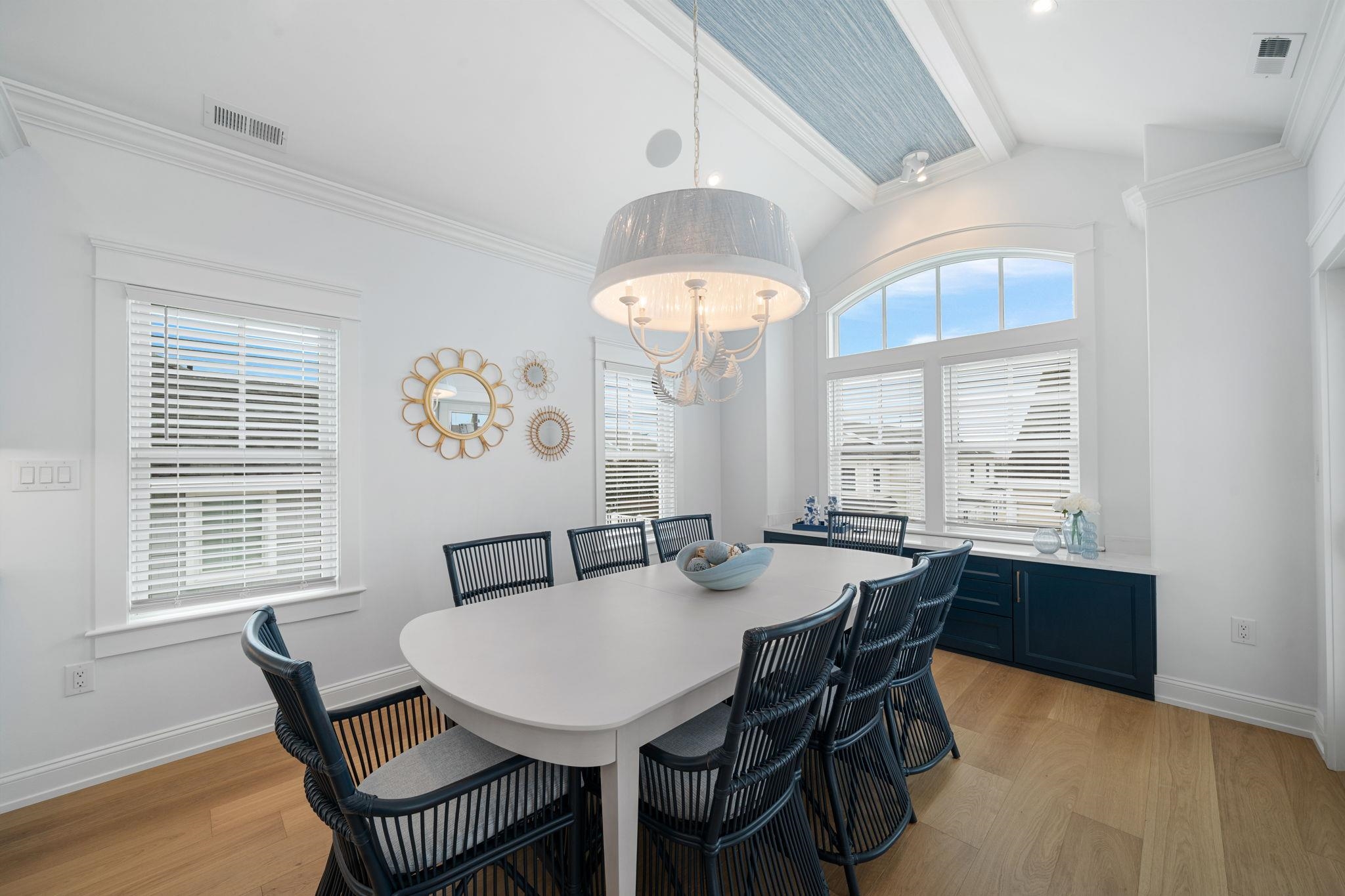 Perfectly positioned on a prestigious corner in the heart of Stone Harbor, this exceptional new construction by SeaLuke Developers blends timeless coastal elegance, thoughtful architectural design, and beautiful bay and sunset views. Ideally located just a short walk to both the beach and town, the home offers an outstanding opportunity to enjoy one of the Jersey Shore’s most sought-after communities. Designed with a classic upside-down layout to maximize light and views, the home features five bedrooms, three full baths, and two half baths, beautifully appointed with decorator furnishings and high-end finishes throughout. Custom millwork, tasteful wallpaper accents on the ceilings and stairwell, and carefully curated design details create a sophisticated yet relaxed coastal aesthetic that feels both refined and welcoming. The first level offers four spacious and beautifully designed bedrooms, providing comfortable accommodations for family and guests. A standout feature is the custom bunk room, which includes two built-in bunk beds with four twin beds and integrated storage—perfect for children while still comfortably sized for adults. This level also features an inviting secondary family room, creating a flexible living space ideal for guests, movie nights, or relaxing evenings after a day at the beach. The expansive main living level serves as the heart of the home, offering a bright and open great room where the kitchen, dining, and living areas flow seamlessly together. The chef’s kitchen is beautifully appointed with Sub-Zero and Wolf appliances, a wine cooler, microwave drawer, and an oversized quartz island with seating for five. Built-in seating in the living room and a thoughtfully designed dining buffet provide both style and functionality, making entertaining effortless. Large sliding doors open to wraparound decks and covered porches that extend the living space outdoors and capture beautiful elevated bay views above Third Avenue. These outdoor areas create wonderful spaces for gathering with family and friends, enjoying refreshing coastal breezes, and taking in Stone Harbor’s spectacular sunsets. The luxurious primary suite offers a peaceful private retreat, complete with a spa-inspired bathroom featuring a spacious walk-in shower, sauna, and smart toilet—creating a relaxing environment designed for comfort and wellness. The third floor includes a built-in office nook that enjoys lovely bay views, offering an ideal spot for working remotely or enjoying a quiet reading space. A Juliet railing overlooking the great room below adds a striking architectural detail while enhancing the home’s sense of openness and natural light. Additional highlights throughout the home include six custom window seats with upholstered cushions, custom built-ins in every bedroom, and generous walk-in attic storage. Extensive storage is also available beneath the home and under the covered porches, featuring a concrete floor and nearly six-foot ceilings—perfect for storing bikes, beach gear, and outdoor equipment. The home is wired for electronics and includes two large-screen televisions, one of which is a Samsung Frame TV that blends beautifully with the home’s interior design. The property has also been thoughtfully engineered to accommodate a future exterior elevator should the next owner desire one. Outside, a private heated elevated swimming pool with fencing and privacy provides the perfect place to unwind or entertain after a day at the beach. Ideally located less than three short blocks from Stone Harbor’s wide, white sandy beaches and a short stroll to the town center, the home offers convenient access to charming cafés, boutique shopping, restaurants, ice cream shops, parks, a movie theater, and a luxurious full-service spa overlooking the bay. Combining exceptional design, quality construction, and a highly walkable location, this beautiful Stone Harbor home offers the very best of coastal living and is perfectly s